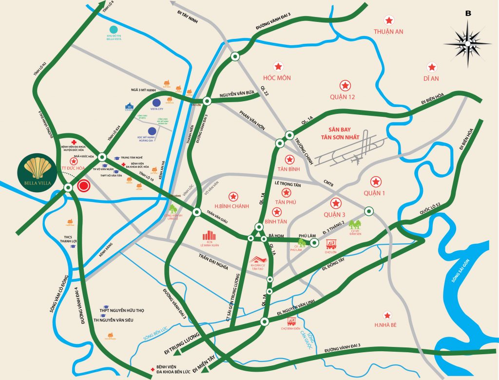 Khu đô thị sinh thái kiểu mẫu Bella Vista tọa lạc ngay vị trí đắc địa trung tâm Tây – Bắc TP.HCM, dự án nằm trên trục đường chính Quốc lộ 22, tiếp giáp với thị trấn Củ Chi, là cửa ngõ giao thương kết nối các vùng lân cận với TP.HCM thông qua tuyến đường huyết mạch Tỉnh Lộ 8, Tỉnh Lộ 9 và trục đường vành đai IV. Một mặt của khu đô thị tiếp giáp với sông Thầy Cai mang lại hướng phong thủy tối ưu “tam cận” theo lối phong thủy “nhất cận thị, nhị cận giang, tam cận lộ”, kết nối các địa điểm trọng yếu của TP.HCM với các tỉnh Đông Nam Bộ và Miền Tây.